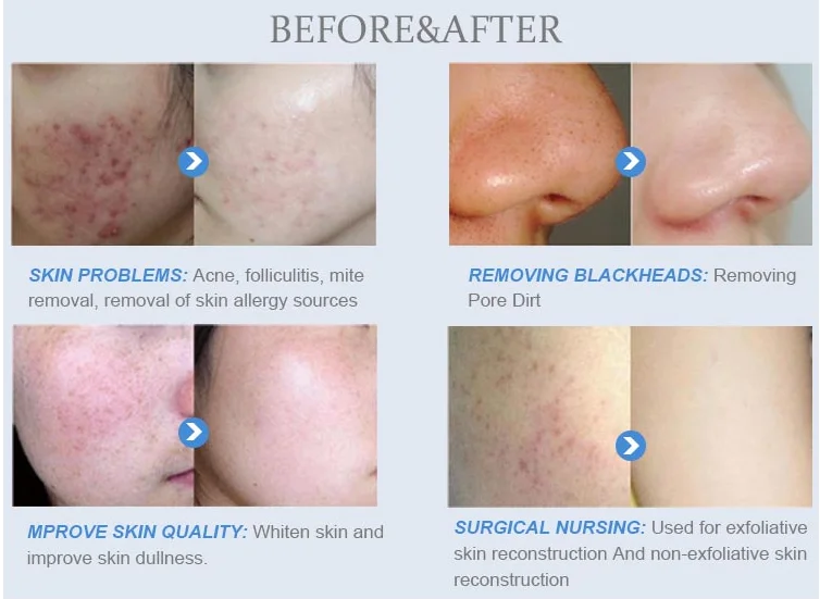 La machine Hydro Oxygen Dermabrasion utilise l’oxygène sous une pression extrême et l’eau, prend de minuscules gouttes d’eau, par pulvérisation pour agir sur la peau. Il peut pénétrer les composants nutritifs aux pores et aux fissures de la peau de l’épiderme à la couche de derme, puis favoriser la renaissance des cellules, rapidement et fournir directement l’élément nutritif riche pour la peau.