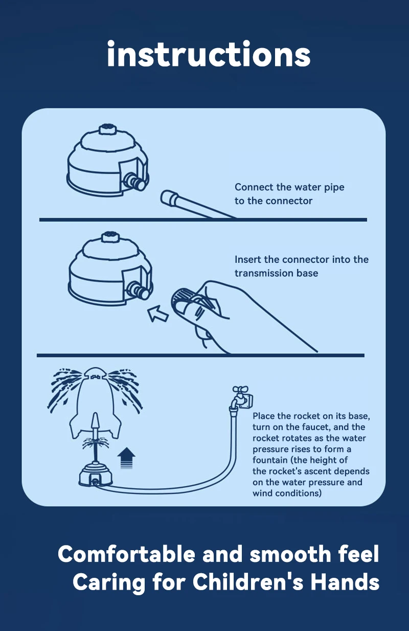Facile à utiliser, connectez le tuyau d’eau au connecteur, insérez le connecteur dans la base de l’émetteur, enfin, placez la fusée sur la base et allumez le robinet.