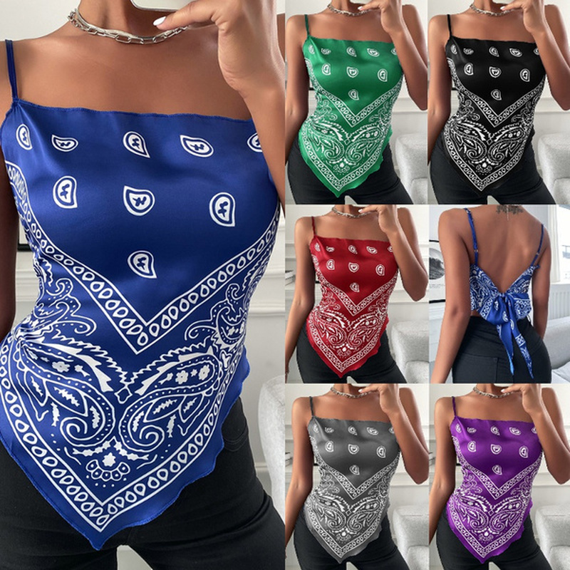 Hauts pour femmes été sans manches imprimé gilet nœud papillon dos nu Blouse Sexy Streetwear Top Satin Mouchoir Blouse Plus Size Camisole